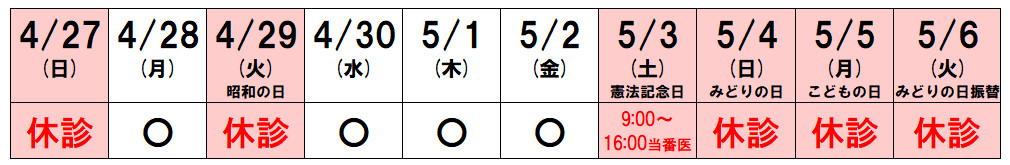 ゴールデンウィーク期間の診療日のご案内