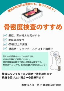皆さまの骨折予防や骨粗しょう症予防につながりますので、検査をご希望の方は各診療科・放射線科へお気軽にご相談ください。