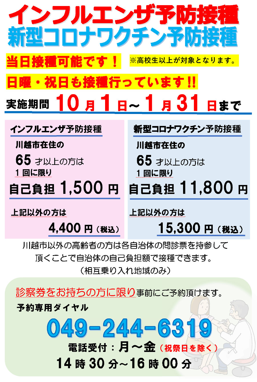 日曜・祝日のインフルエンザおよび新型コロナワクチン接種を開始します