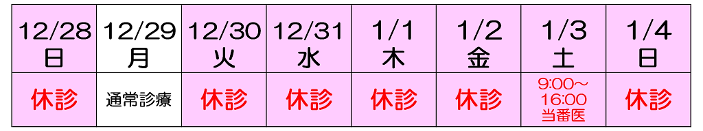 12月30日(火)、31日(水)、1月1日(木)、2日(金)、4日(日)は休診とさせていただきます。